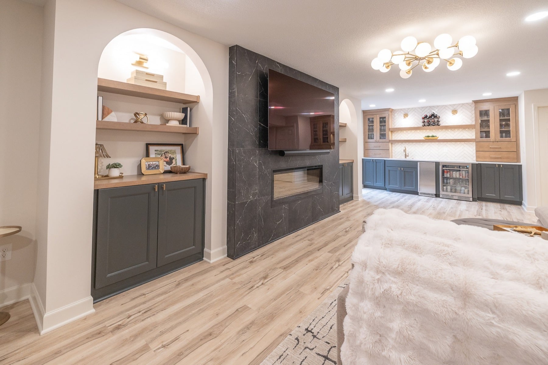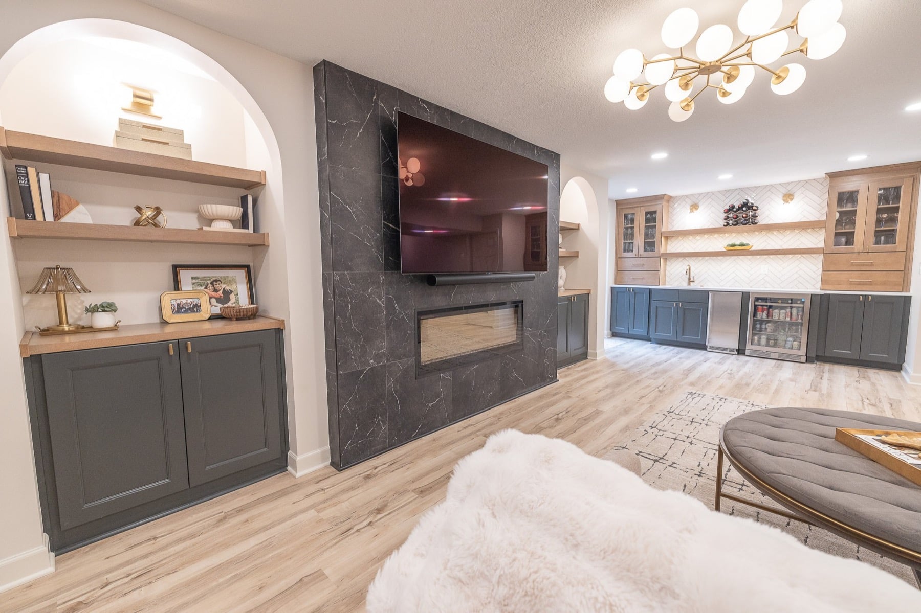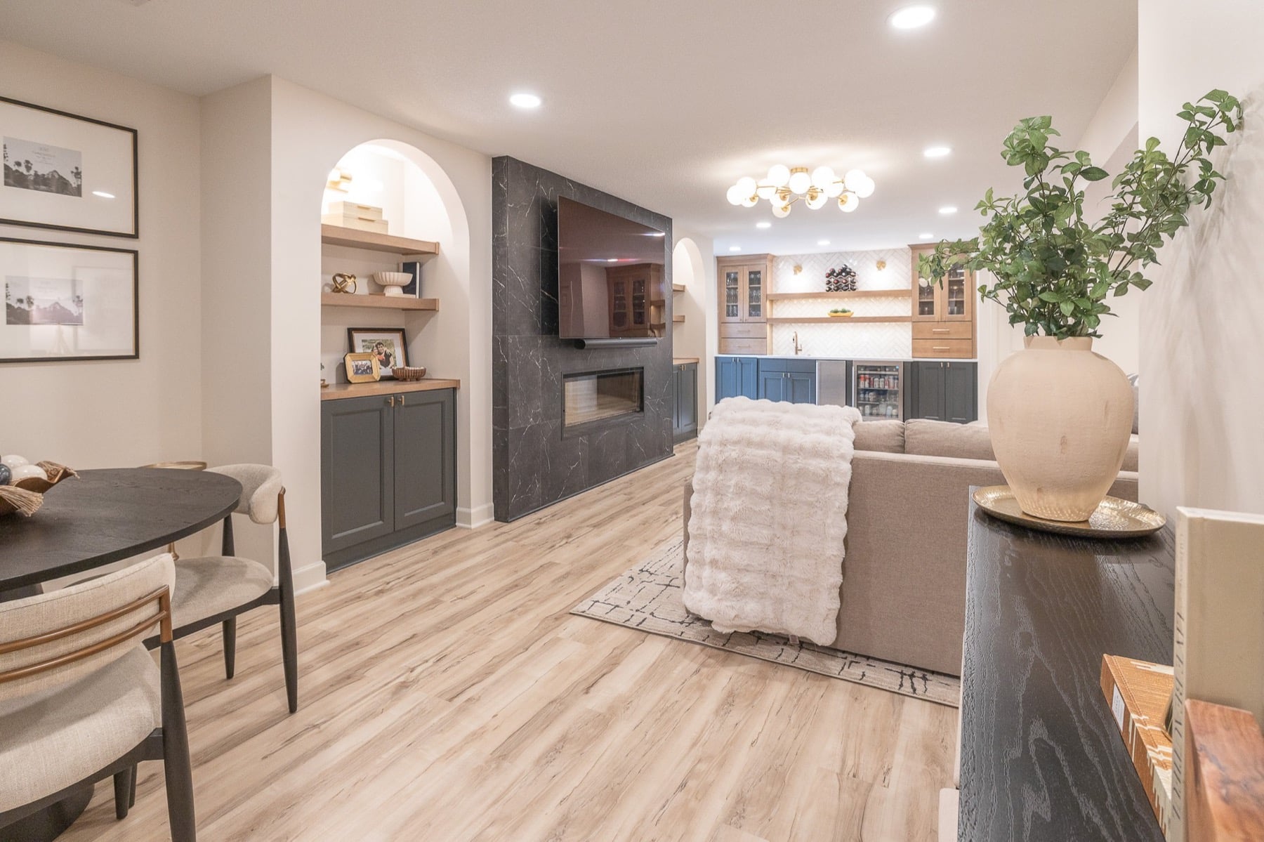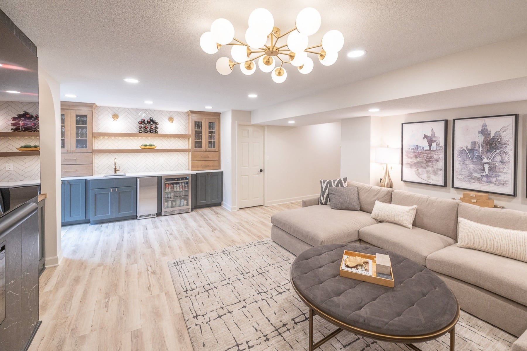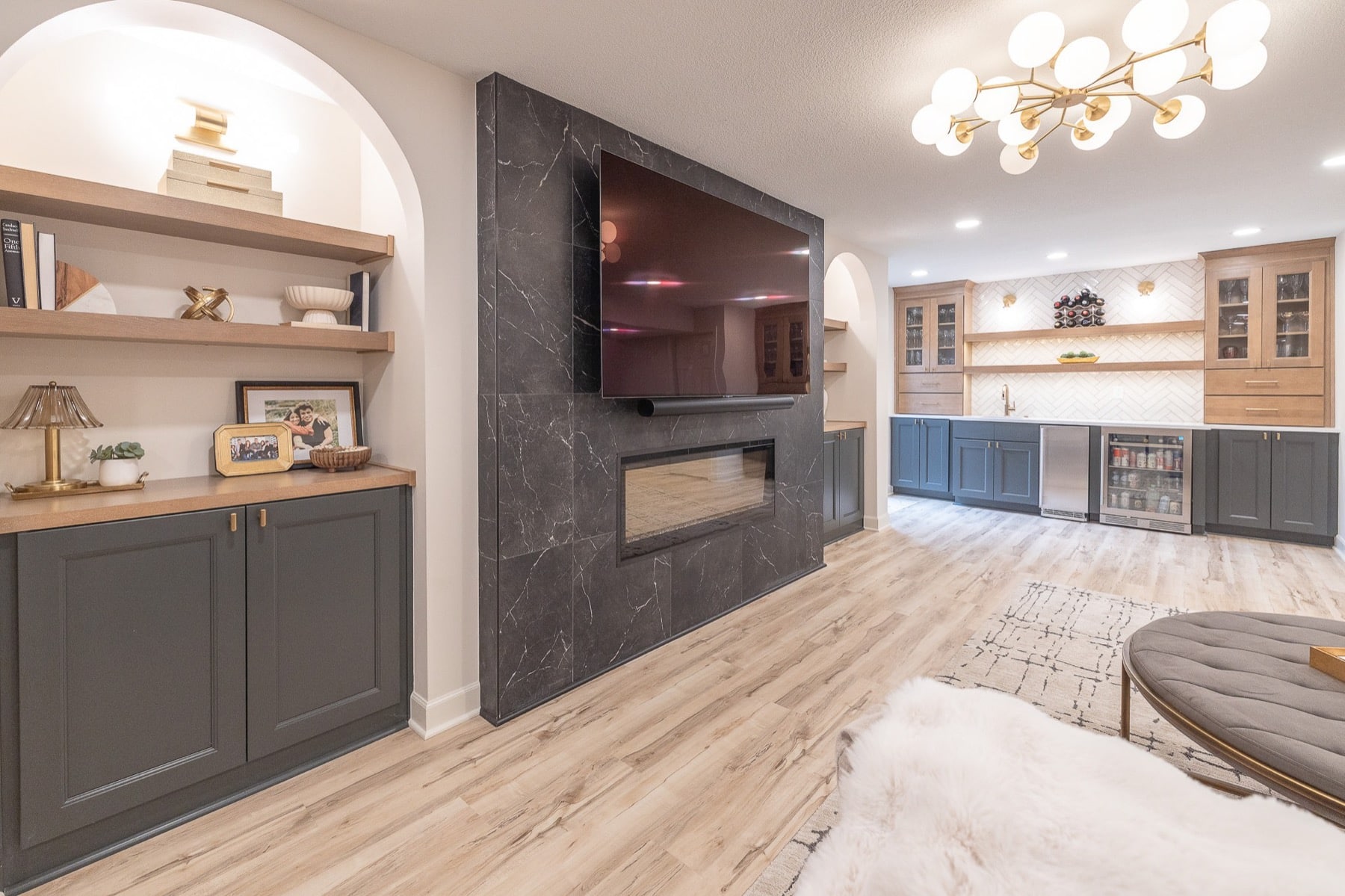 Our design-build team added a new bedroom with an egress window to introduce natural light, enhancing the openness of the entire space. A custom-designed media wall anchors the main living area, creating a sophisticated setting for gathering, relaxing, and entertaining.