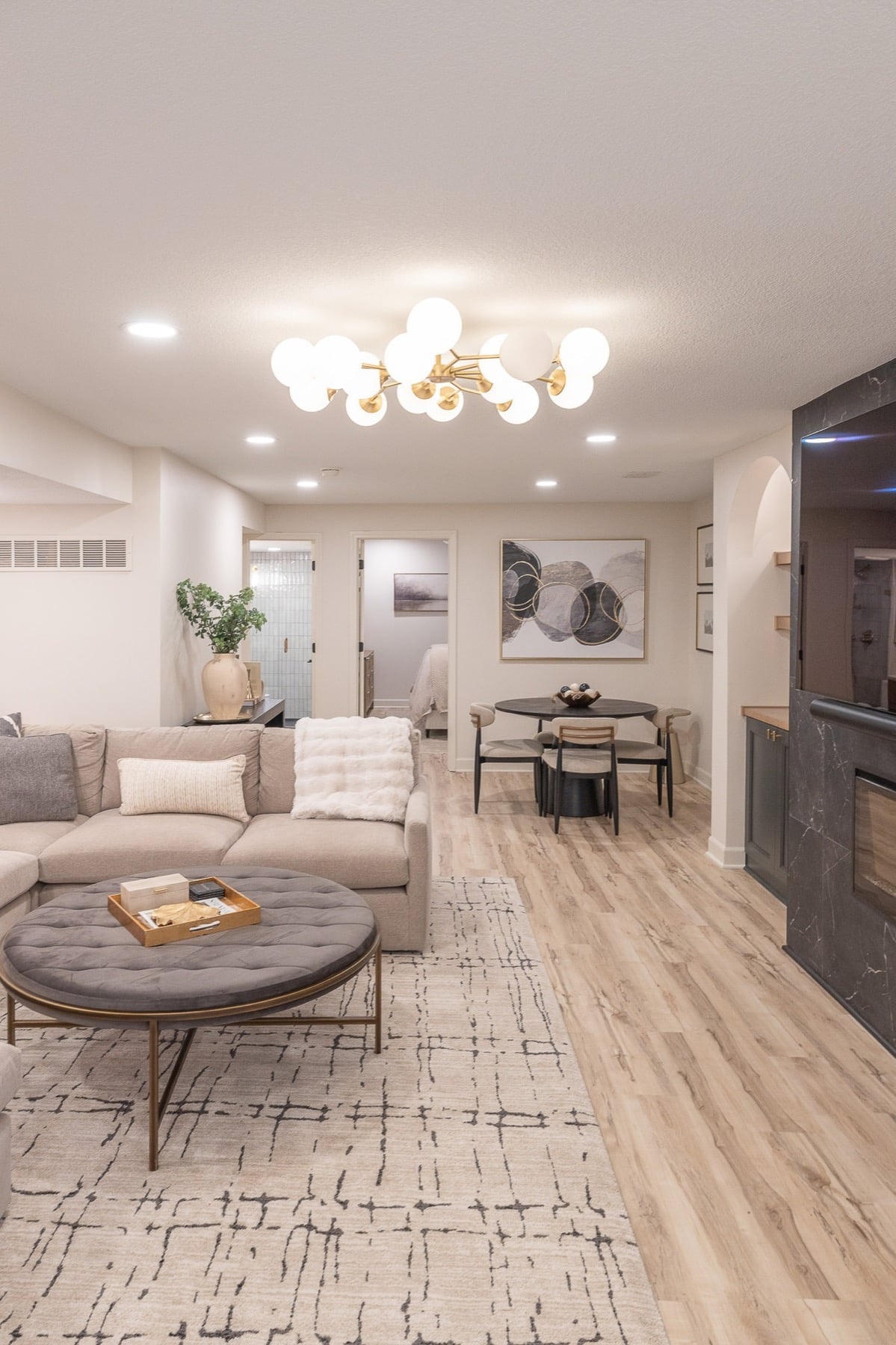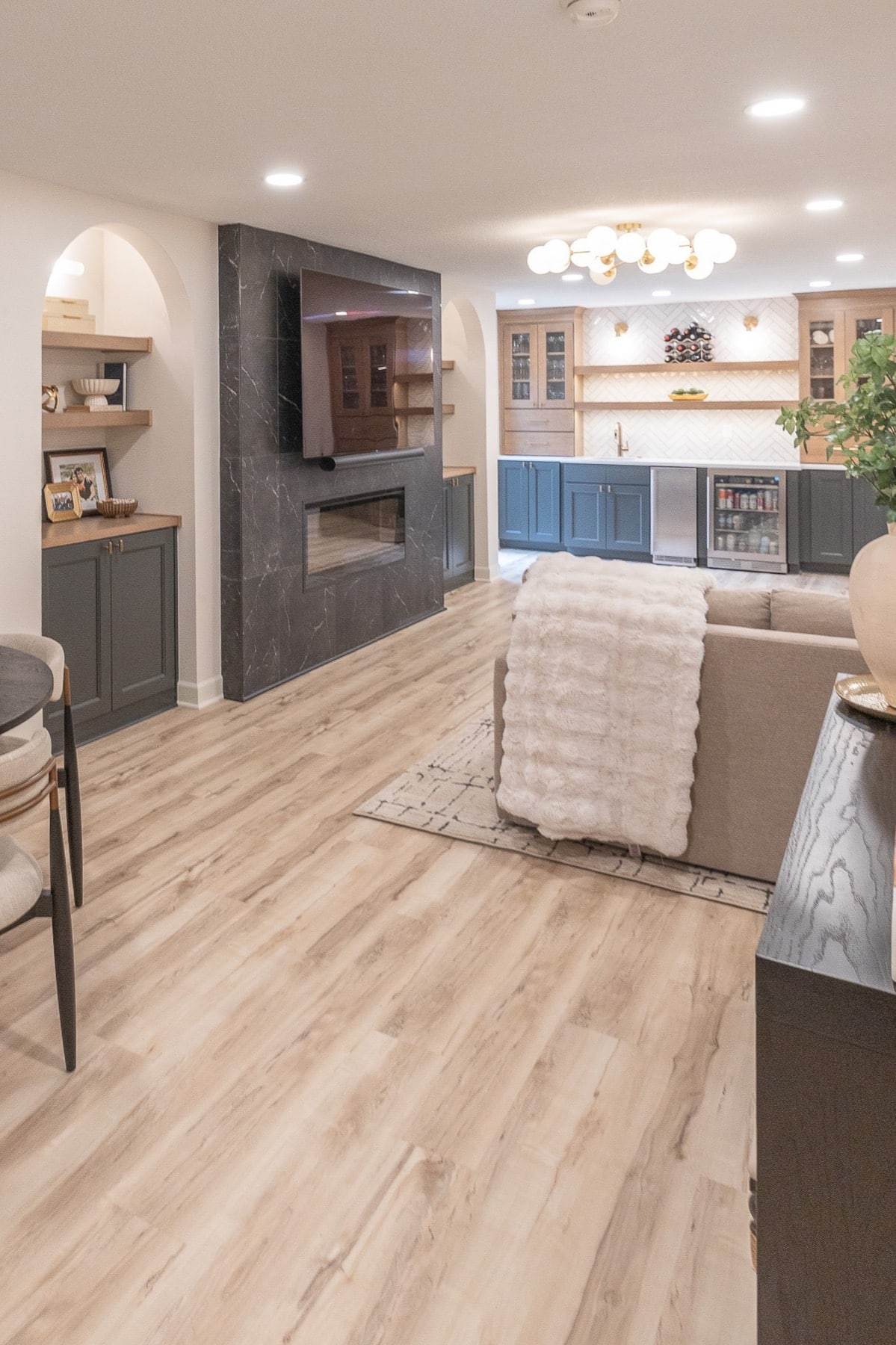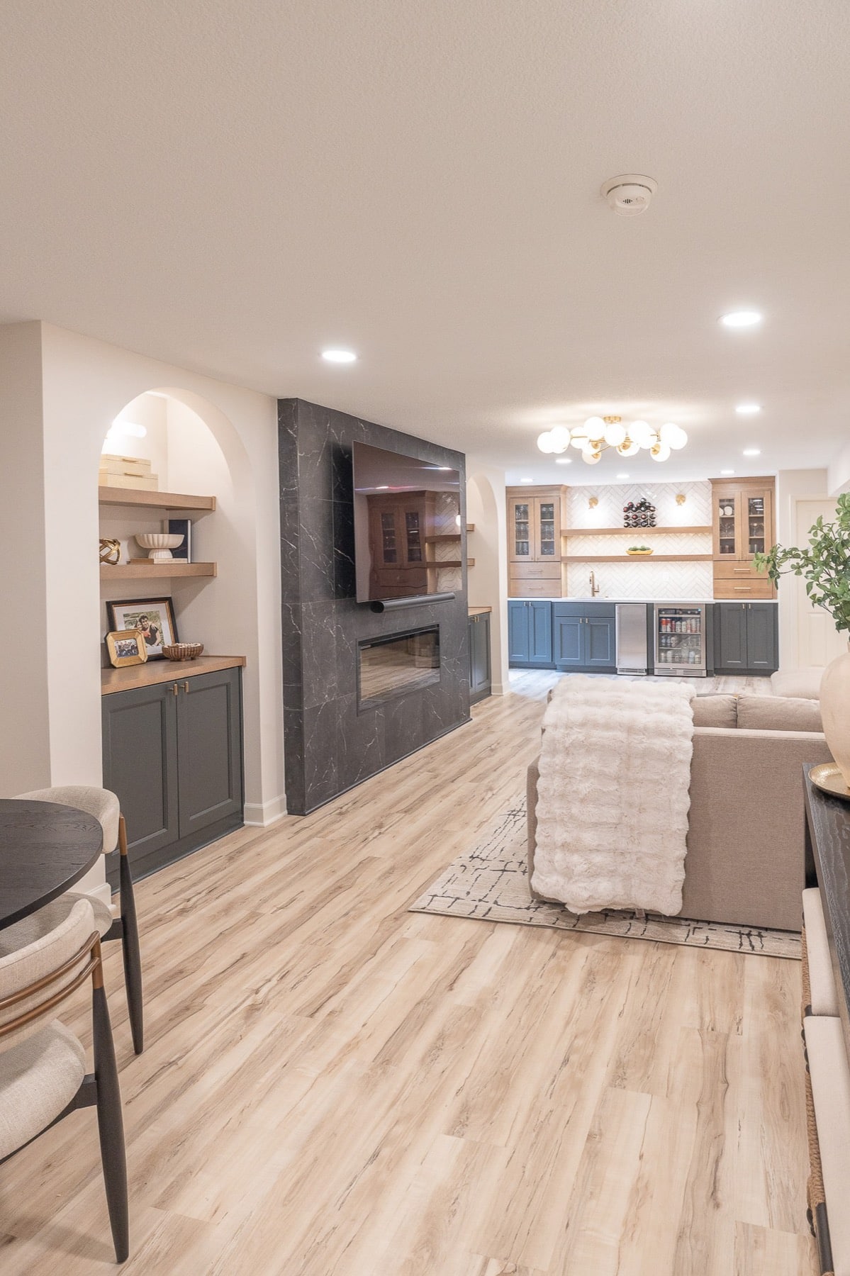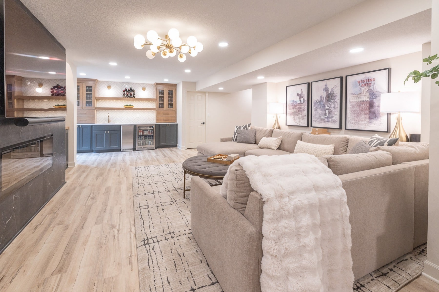 Our design-build team added a new bedroom with an egress window to introduce natural light, enhancing the openness of the entire space. A custom-designed media wall anchors the main living area, creating a sophisticated setting for gathering, relaxing, and entertaining.