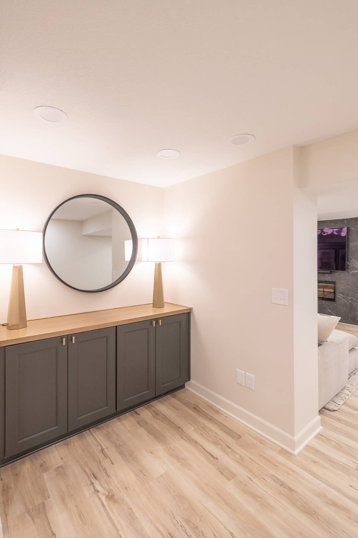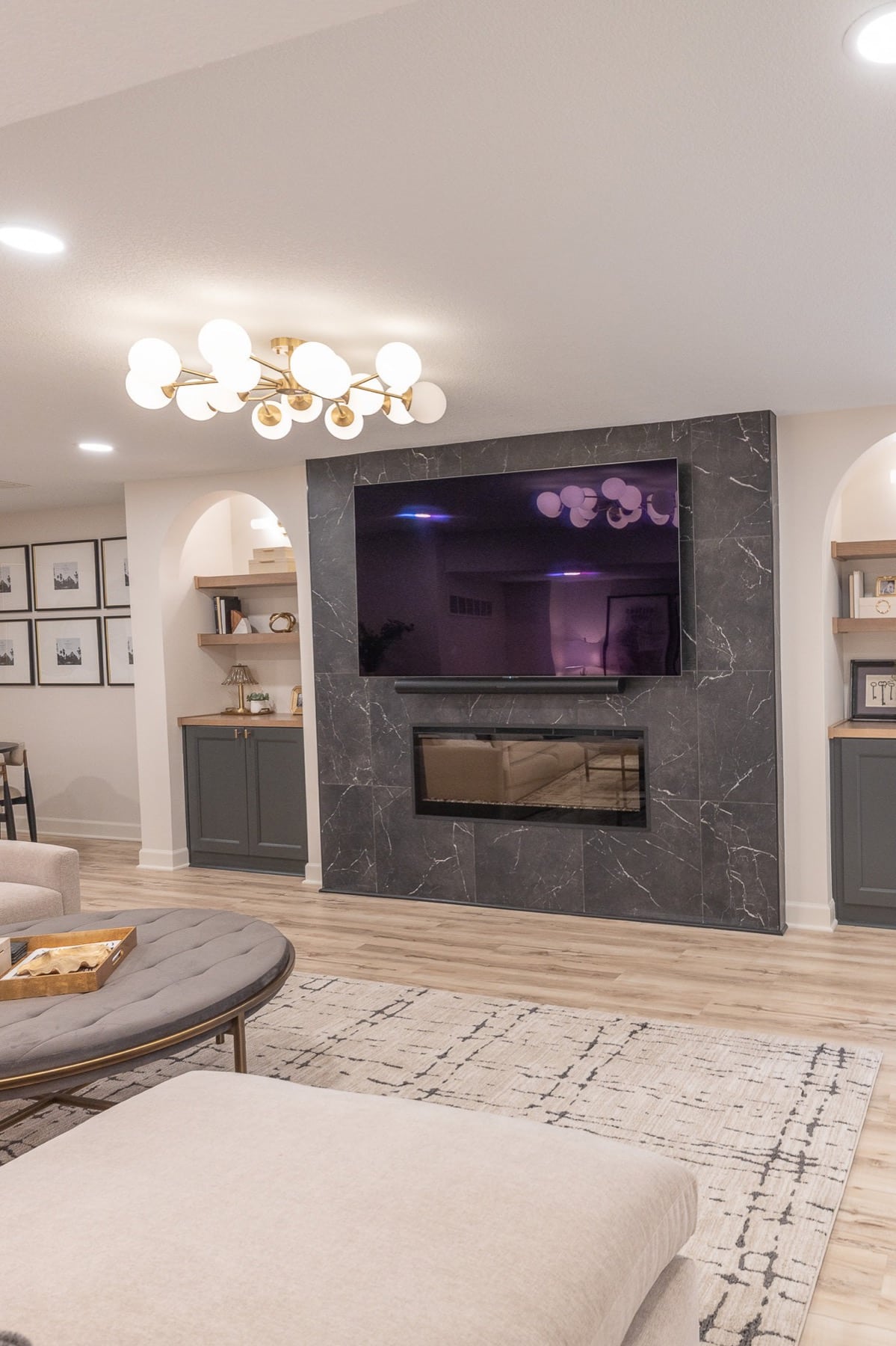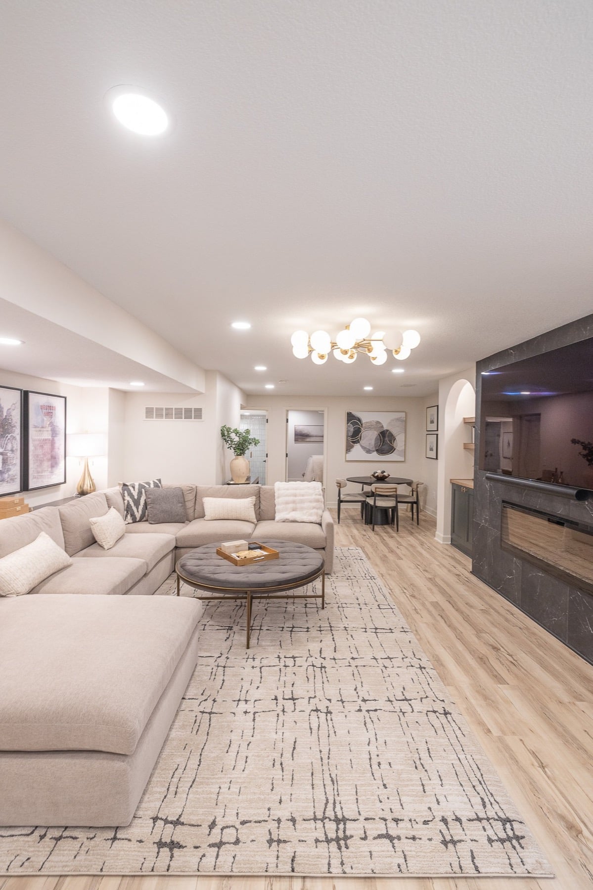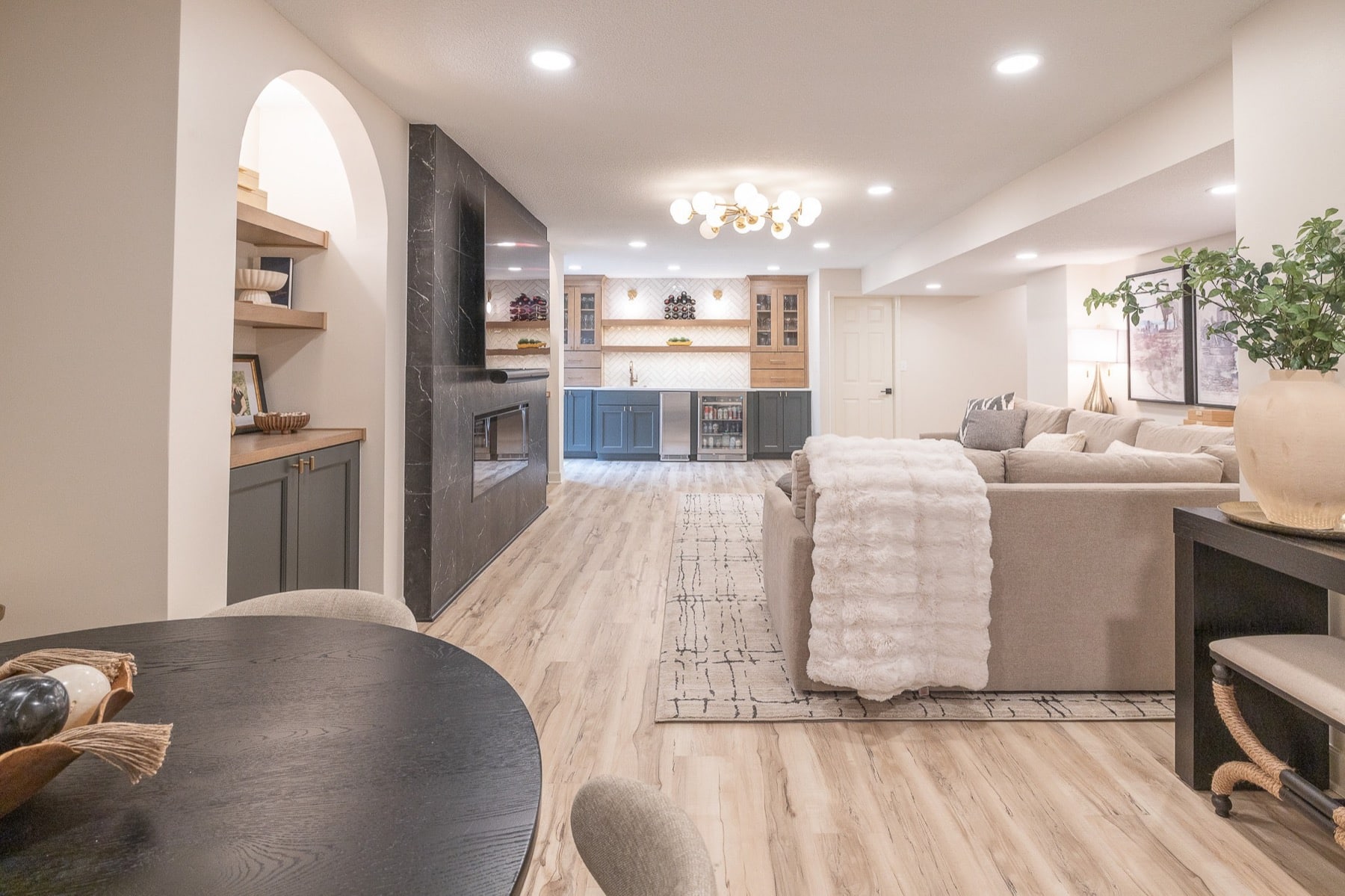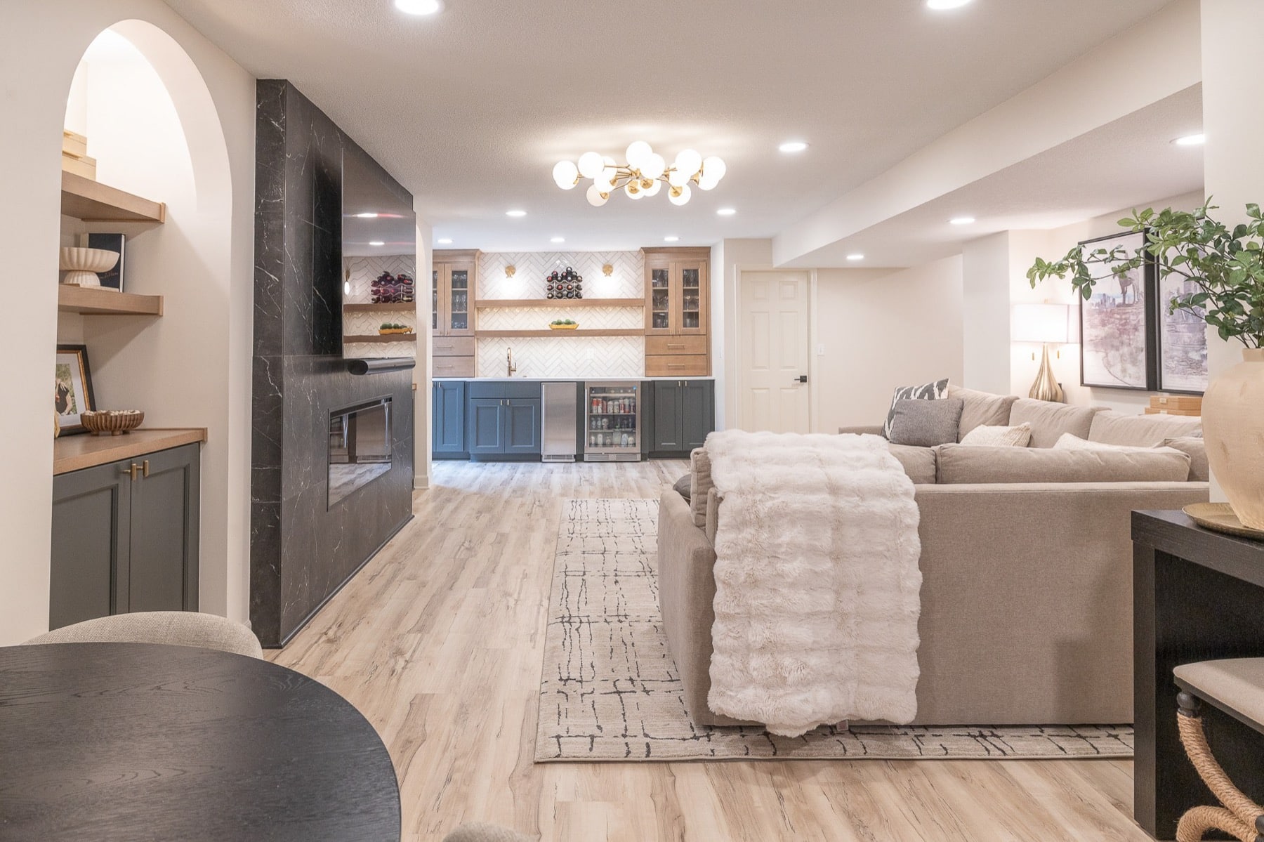 Our design-build team added a new bedroom with an egress window to introduce natural light, enhancing the openness of the entire space. A custom-designed media wall anchors the main living area, creating a sophisticated setting for gathering, relaxing, and entertaining.