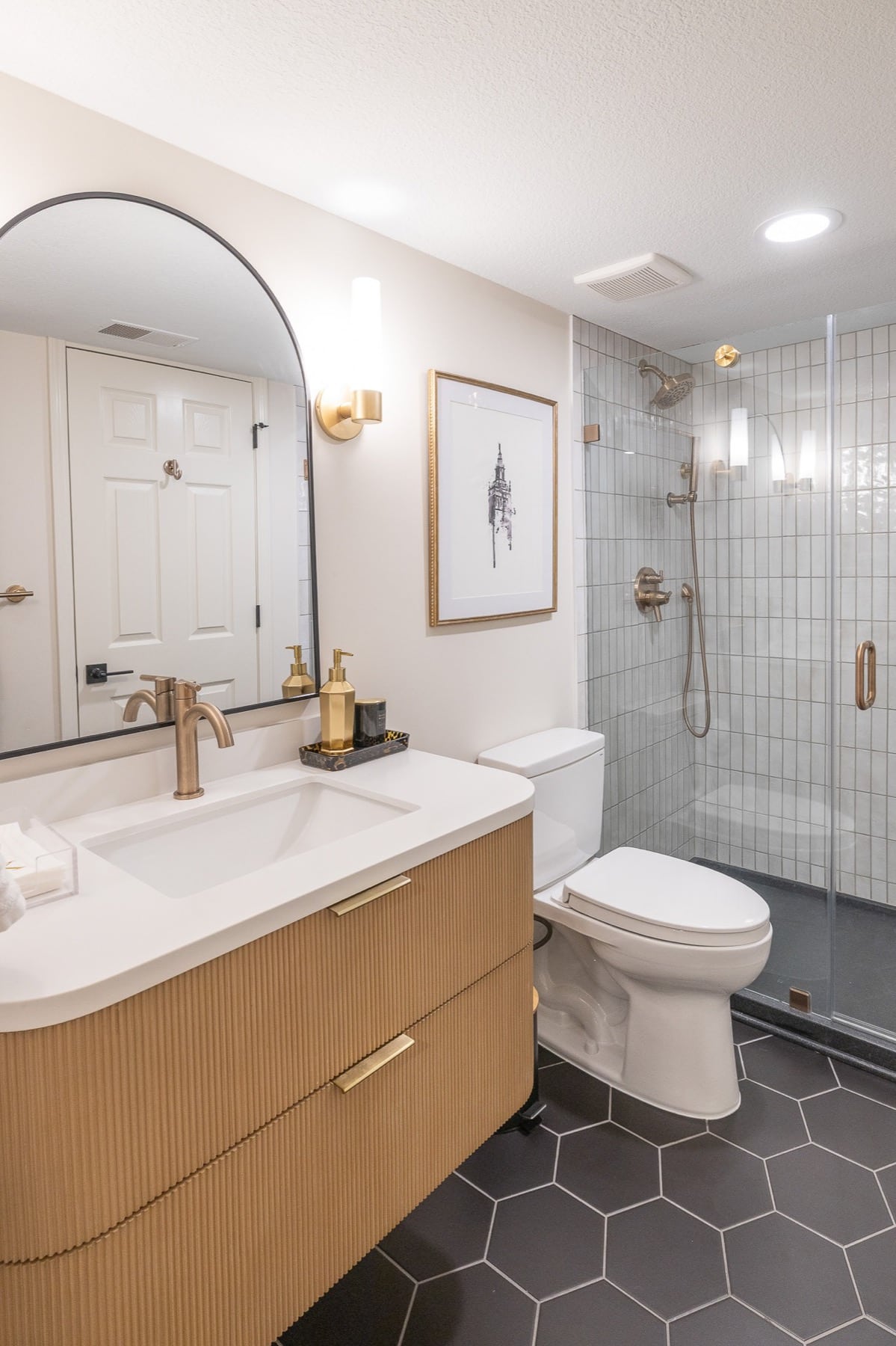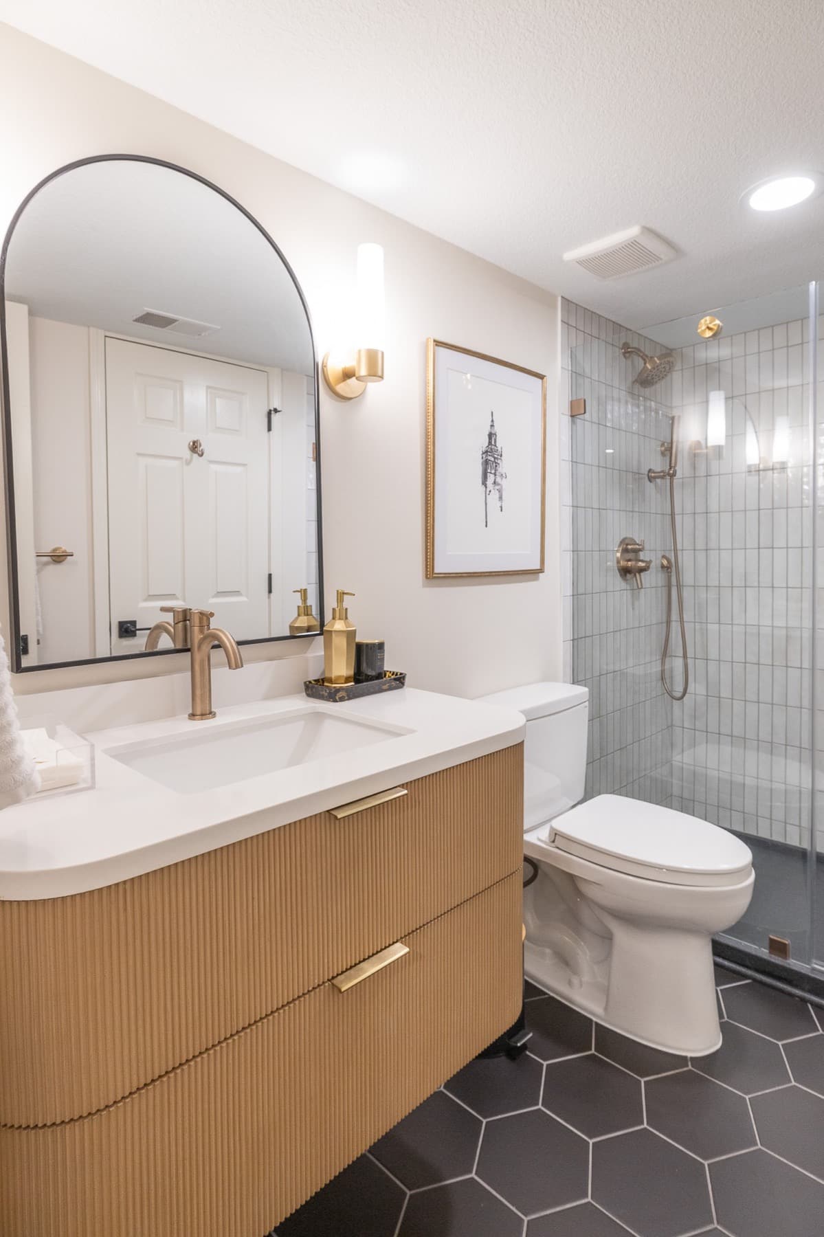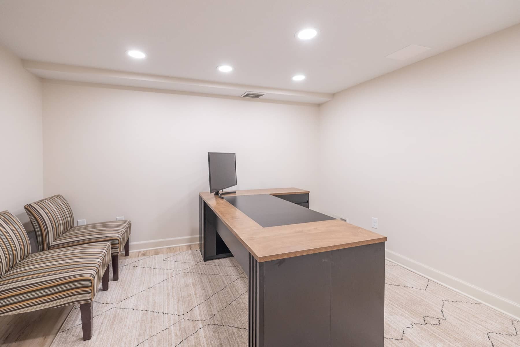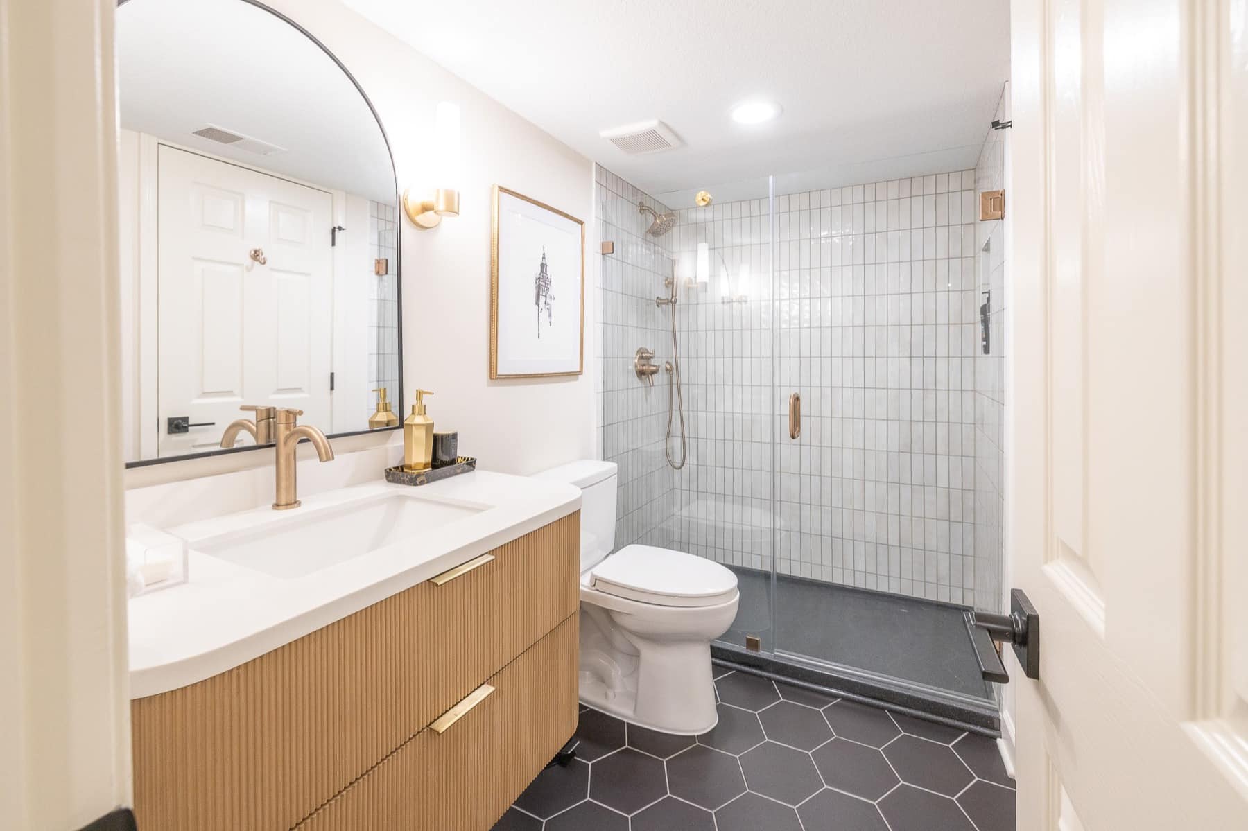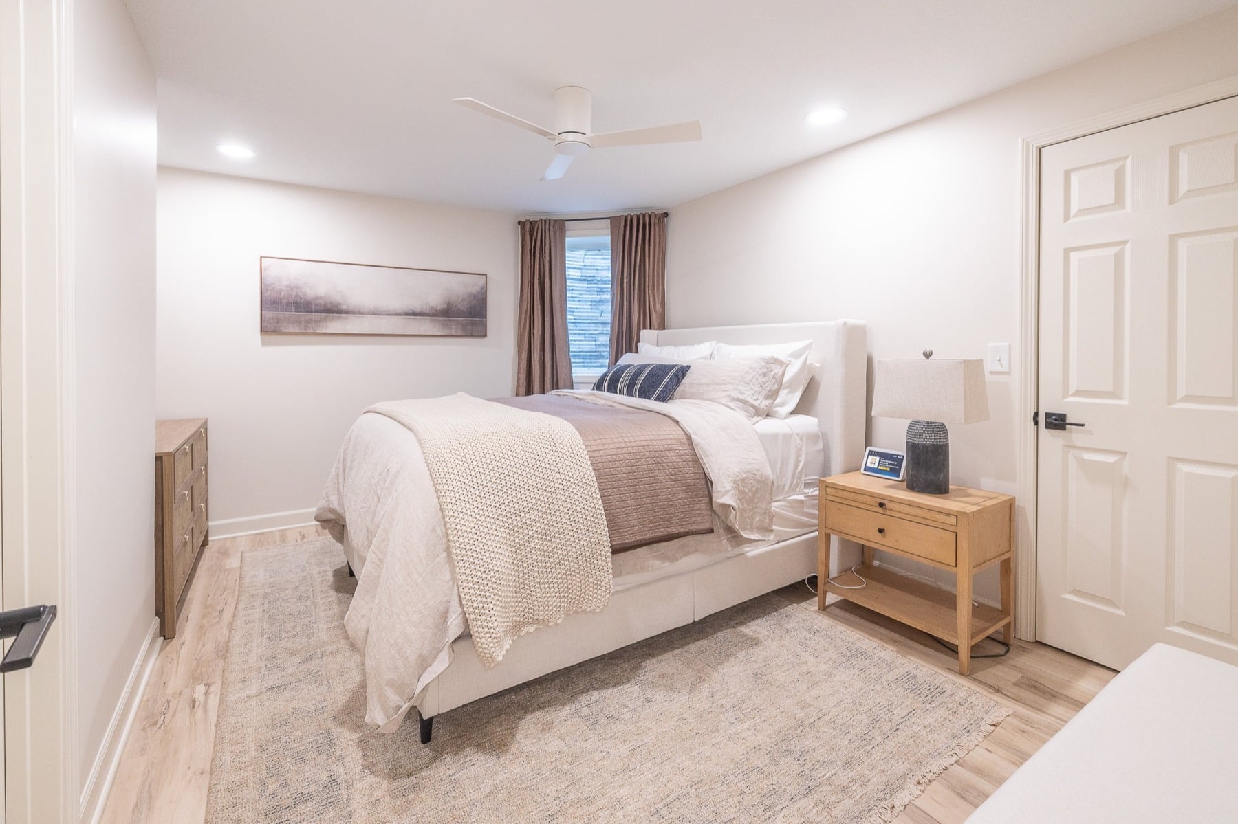 Our design-build team added a new bedroom with an egress window to introduce natural light, enhancing the openness of the entire space. A custom-designed media wall anchors the main living area, creating a sophisticated setting for gathering, relaxing, and entertaining.